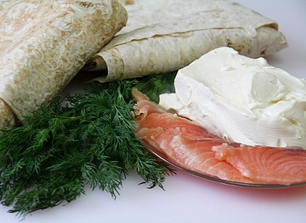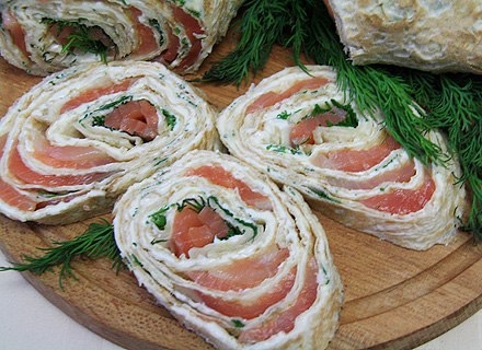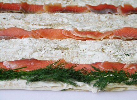 Накрыть вторым листом первый лист лаваша, равномерно распределить по поверхности оставшийся сыр, зелень укропа и ломтики лосося.