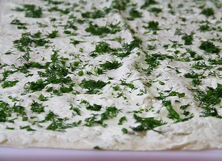 На лист лаваша выложить половину плавленого сыра и с помощью ножа равномерно распределить по поверхности. Большую часть укропа измельчить и посыпать им поверхность лаваша, смазанную сыром.