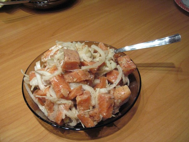 Далее рыба, ещё в замороженом состоянии, очищается от костей и шкуры, режется на правильные кусочки. Потом добавляется соль и перец. Можно, конечно, и предварительно просолить рыбу, но это, на самом деле, не принципиально. Отдельно, в разведённом уксусе, маринуется лук, нарезанный кольцами или полукольцами (способ нарезки - исходя из эстетического мировоззрения).