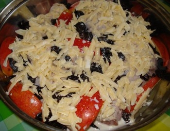 3. Лук очистить, нарезать тонкой соломкой. Сыр натереть на крупной терке. На противень, смазанный раст. маслом, выложить окорочка. На окорочка выложить сначала слой яблок, затем чернослив и лук. Сверху посыпать все тертым сыром и обильно смазать сметаной. Запекать в разогретой до 180 °С духовке в течение 35–40 мин.