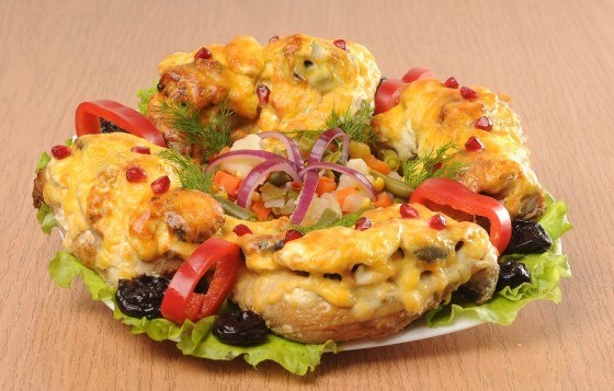 4. Готовые окорочка выложить на блюдо, выстланное листьями салата. Украсить черносливом, зеленью, сладким перцем и красным луком.