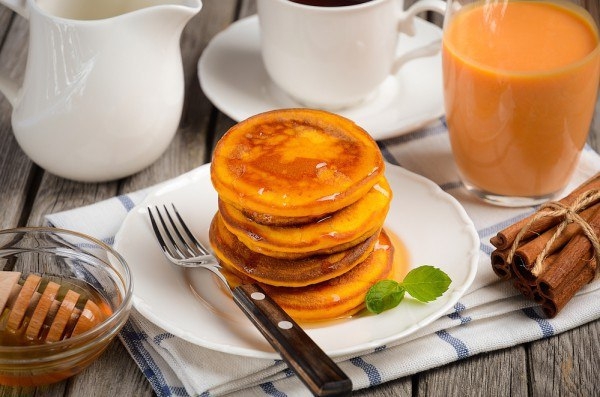Подавай эти золотистые тыквенные оладьи вместе с жидким медом и кусочком сливочного масла.