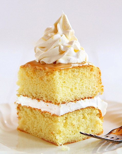 Накрыть вторым коржом, полить карамелью и с помощью кондитерского шприца, украсить торт сливками.