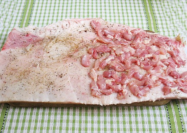 Расстилаем кусок сала на доске, солим и перчим его по вкусу (лучше обильно!). На этом этапе можно добавить натертую морковь (будет смотреться красиво и ярко, но вкус вареной моркови все же будет!), пластинки чеснока (тогда закуску нельзя кушать до работы (хи-хи!). Я добавила немного куриного мяса. Просто срезала мякоть с 1 окорочка, нарезала мелкими кусочками и выложила на половину куска сала.