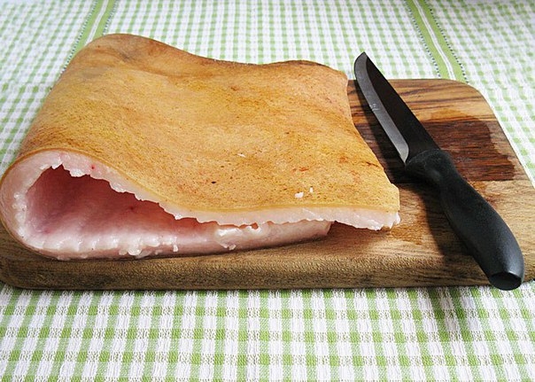 Итак, раз у меня большой и толстый для рулета кусок, его нужно обрезать. Все просто - срезаем лишнее сало до той поры, пока не останется тонкий слой. Попробуйте свернуть рулетом. Сворачивается легко? Хорошо, у Вас получилось то, что надо.