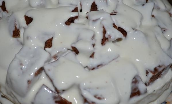 5. Собираем торт: нижний корж темный с орехами наколоть вилкой, смазать кремом, накрыть белым коржом. Наколоть, смазать. Кубики обмакиваем в крем, выкладываем горкой на белый корж. Украшаем растопленным шоколадом (или глазурью) и орехами.