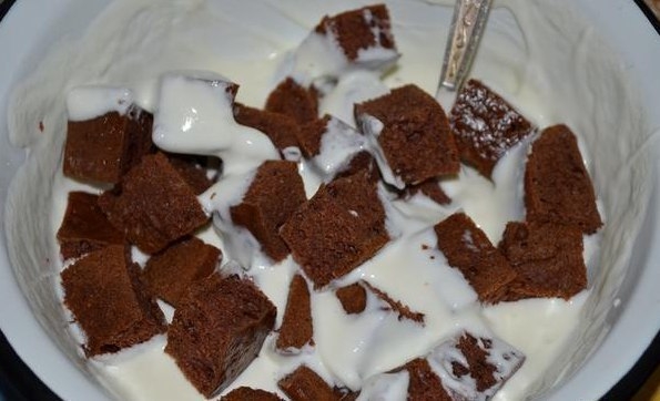 4. Который без добавок корж порезать кубиками.