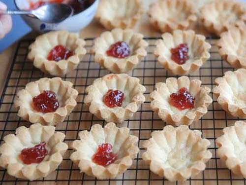 Выпекаем тесто в заранее разогретой до 170 градусов духовке, до золотистого цвета. Готовое тесто вынимаем из духовки, даем ему постоять 3 минуты и вынимаем из формочек. Когда тесто остынет, кладем в него начинку из варенья или джема (желательно с кислинкой).