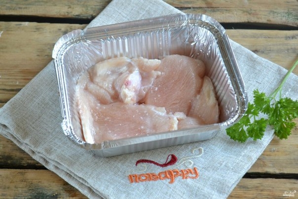 Куриную грудку порежьте на тонкие пластины толщиной около 5 мм. У меня получилось 4 такие пластины. 2 штуки выложите на дно формы для запекания, сверху полейте соусом.