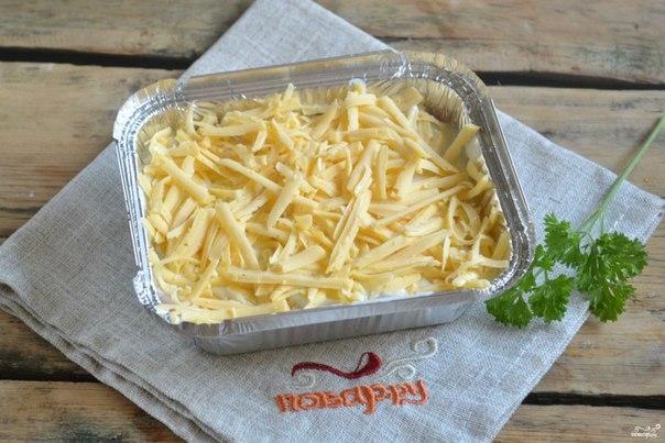 Сверху присыпьте тертым твердым сыром, отправьте в разогретую до 180 градусов духовку на 30 минут.
