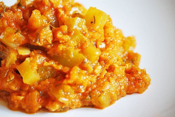 Затем измельчить в мясорубке или блендере, перемешать, добавить соль, сахар и уксус, варить 1-1,5 часа. Готовую икру закатать в стерилизованные банки.