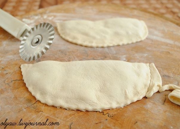 5. Накрыть второй половиной, придавить ладонью чтобы вышел воздух, края придавить, затем обрезать резачком с колесиком, если такого нет то можно придавить края вилкой. Готовый чебурек должен быть не больше ладони размером.