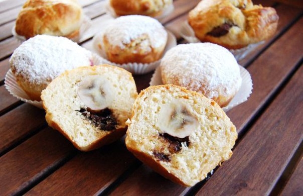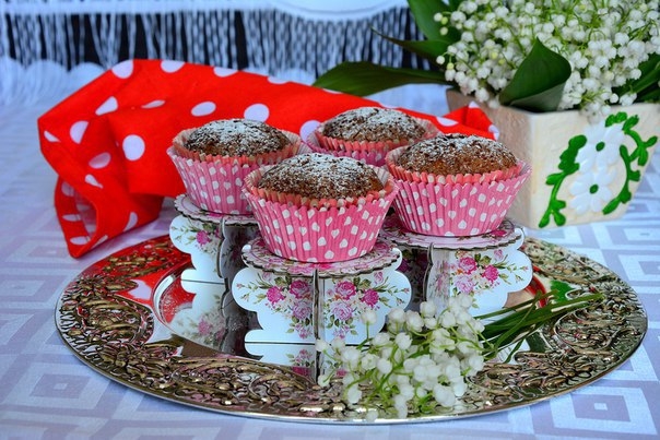 Духовку греем до 180°, готовим формочки...И заполняем формочки так:- по 1 с.т. теста в каждую формочку;- по 1 ч.л. варенья на тесто;- остаток теста распределить по формочкам - тесто должно полностью покрывать варенье.Остаток сахара (40 г) и корицы (1 ч.л.) смешать и посыпать смесью кексы.