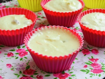 9. Творожная масса перекладывается в силиконовые формочки (смазывать которые не надо) либо в большую прямоугольную форму для кекса (в оригинале).