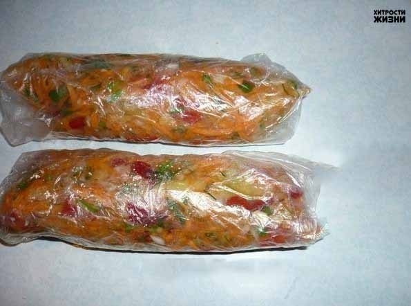 Пусть вас не смущает наличие помидоров, они при замораживании становятся немного другими, но вкус дают замечательный. Все нужно нарезать соломкой и кубиками. Морковь пропустить через комбайн, на средней тёрке (почти как на корейской получается, но можно тереть как хотите), перец нарезать соломкой. Помидоры и лук режем средними и мелкими кубиками. Зелень просто мелко режем. Всё перемешиваем. Складываем в обычные полиэтиленовые пакеты и скручиваем "колбаски" (так удобнее потом отламывать столько сколько вам нужно). Можно замораживать в пакетиках для завтраков, они небольшие - 15Х20, как раз или на 1 или на 2 раза заправить блюдо. Можно замораживать и в пластиковых контейнерах, но из них потом не очень удобно извлекать порции и, что немаловажно - они гораздо больше занимают места в морозилке. ВАЖНО! Запускать эту заморозку, когда всё уже готово. Если это первое блюдо, то кладем заморозку, ждем когда закипит и сразу же выключаем. А если второе, то кладем заморозку, перемешиваем и через пару минут выключаем .