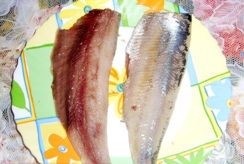 3. Разделим сельдь на два филе, удалим хребет и реберные кости.