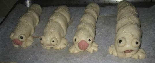Сделать из теста ножки (пальчики надсечь ножом) и глазки с горошинами перца.