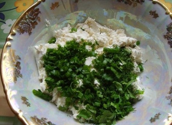 Шаг 2: В глубокой миске смешать творог с мелко нарезанной зеленью. Посолить по вкусу.