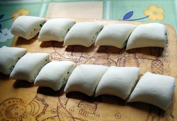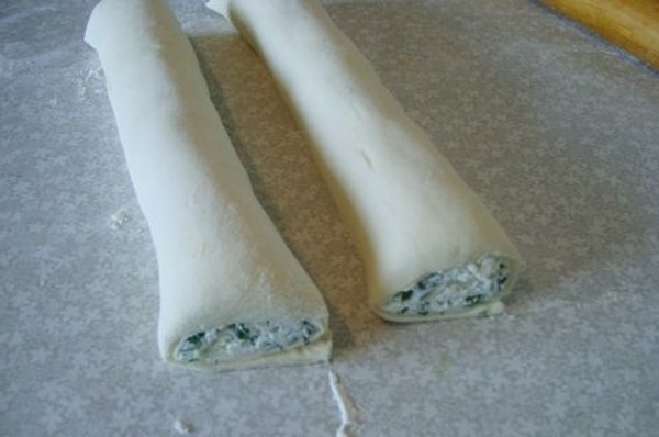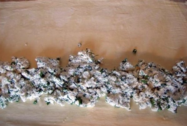 Шаг 4: Отступив немного от края, выложить творожную начинку. Завернуть тесто в плотный рулет. При каждом новом слое необходимо прижимать руками тесто, чтобы не было больших просветов.