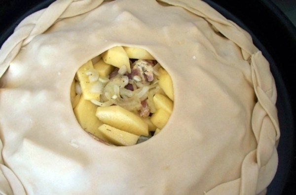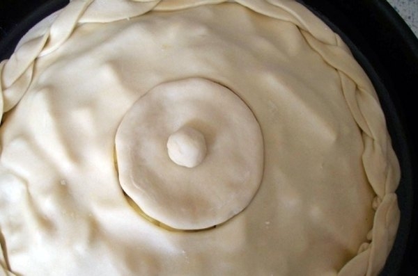 Шаг 4: Раскатать еще одну лепешку, в середине сделать дырочку, диаметром со стакан. Накрыть начинку, а края плотно защипнуть.