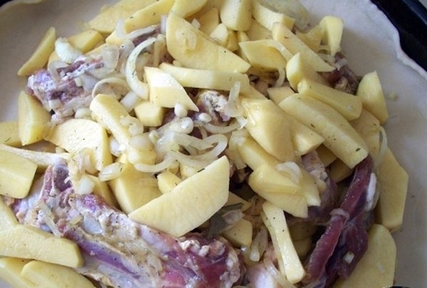 Шаг 1: Картофель очистить и промыть. Мясо и картофель нарезать, посолить и поперчить по вкусу. Перемешать.