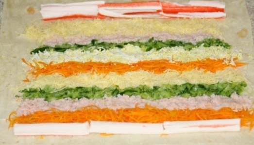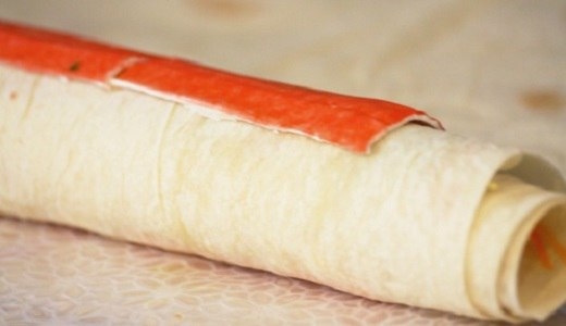 3. Следующим этапом нужно аккуратно и плотно свернуть рулетом. Не торопитесь, чтобы слои начинки ровно заворачивались. Тот край, где красная часть от крабовых палочек, сверните ровно по палочкам. Возьмите пищевую пленку и заверните рулет. Уберите в холодильник минимум на 45-60 минут.