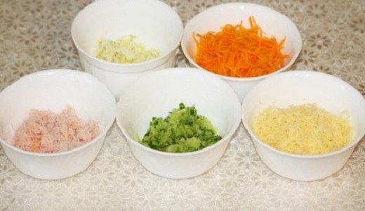 1. Первым этапом будет подготовка всех ингредиентов начинки. Отварные яйца, бекон, сыр натрите на мелкой терке. Вымойте огурец, обсушите, тоже натрите и откиньте на дуршлаг, чтобы стекла лишняя жидкость. Морковь можно слегка нарезать ножом. Крабовые палочки аккуратно разделить, сняв верхний красный слой.