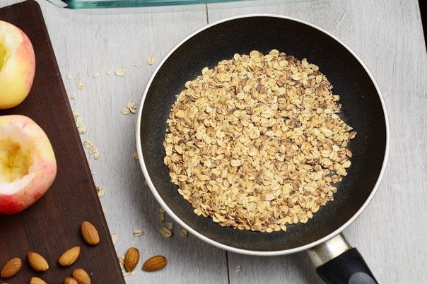 4. Наполнить яблоки смесью из овсянки, крупно нарубленного миндаля и клюквы.