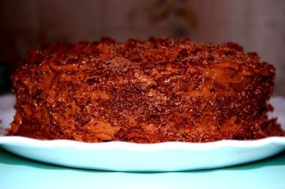Бисквит остыл (у меня получилось пять коржей), смазываем кремом коржи и бока торта, сверху посыпаем крошкой от коржей и тертым оставшимся шоколадом.