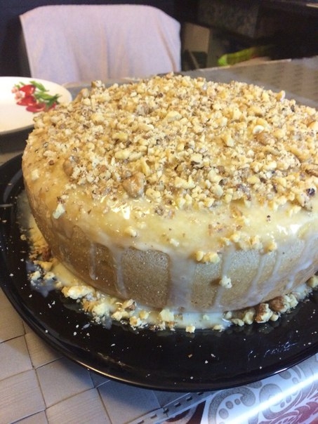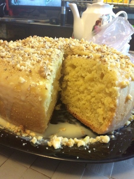 Достать пирог с помощью вставки для варки на пару, уложить на тарелку светлой стороной вверх и украсить ее по желанию сгущенкой, вареньем, измельченными грецкими или другими орехами!!!! Приятного чаепития!