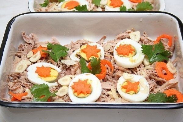 Яйца порезать вдоль и разложить сверху мяса, добавить нарезанную морковь, чеснок, и в завершении украсить зеленью петрушки или кинзы.