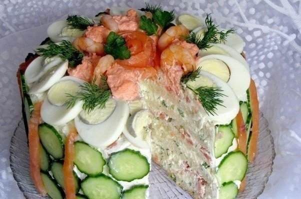 Для украшения аккуратно нарезать яйца и огурцы кружками. Огурцы порезать очень тонко. Украсить торт креветками, ломтиками семги, яйцами, икрой по собственному вкусу. Бока торта обложить кружками огурцов. Наш торт готов.