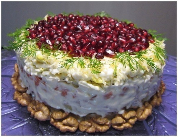 Сверху положить зерна граната. Если делаю на праздник, то гранатинками делаю буковки или рисунок.