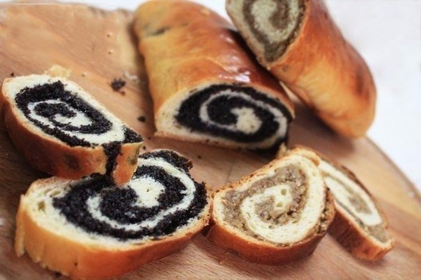 3. Тесто раскатать в тонкий пласт и по всей поверхности равномерно распределить начинку из мака. Свернуть тесто в рулет так, чтобы мак оказался внутри. Нарезать булочки высотой в пять сантиметров.