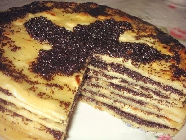 5. Мак запариваем кипятком и растираем в макитре макогоном. Потом добавляем 2-3 ст. ложки воды и нагреваем мак до кипения. Добавляем мед и хорошо размешиваем.Смазываем лепешки маком с медом и складываем одну на другую, как торт. Верхний корж смазываем только медом.