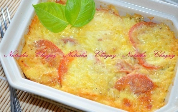 Поставить в духовку при 230* на 30 мин. Затем достать, посыпать оставшимся сыром (который натереть) и вернуть в духовку еще на полчаса.