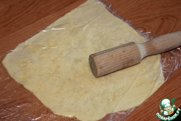Сыр натереть на крупной терке, выложить его в плотный полиэтиленовый пакет, опустить в кастрюлю с кипящей водой, придерживая рукой. Варить 2-3 минуты до размягчения сыра. Сырную массу в пакете выложить на стол, раскатать в тонкий пласт. Верхнюю часть пакета надрезать и удалить.
