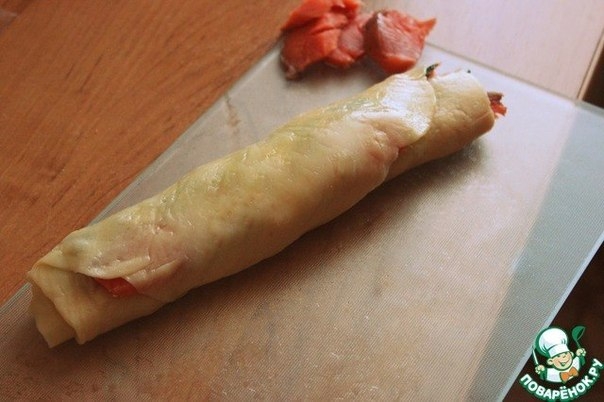 Свернуть рулетом. Накрыть пищевой пленкой. Поставить рулет под легкий пресс, охладить в холодильнике 1 час. Нарезать на ломтики. Если подать на листьях салата - будет смотреться эффектнее.