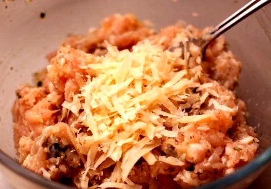 Луковицу очистить и хорошенько измельчить (лучше всего при помощи блендера или потереть на терке) и добавьте к фаршу вместе с яйцом.