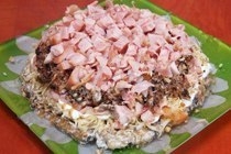 Выкладывать подготовленные ингредиенты на блюдо или в салатницу слоями.