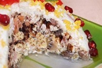 Салат «Сказочная полянка» с копченой курицей и черносливом.