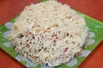 3-й слой: половина сыра + майонез + немного грецких орехов
