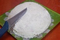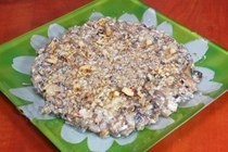6-й слой: половина копченой курицы + майонез + немного грецких орехов