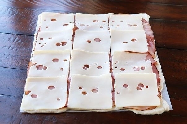 Доску присыпьте мукой. Выложите на нее тесто и раскатайте его в тонкий пласт толщиной 1-1,5 см.На тесто выложите нарезанную ветчину. У меня она довольно большая в диаметре. Важно нарезать ветчину тонко или воспользоваться слайсером (в супермаркете).Возьмите сыр. В продаже имеются упаковки, когда сыр нарезан на пластины. Вместо твердого сыра можно взять пластинки плавленого бутербродного сыра типа "Хохланд". Ветчину накройте пластинками сыра.