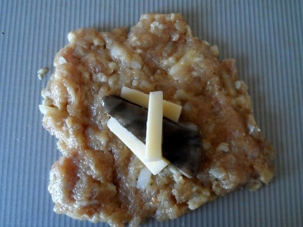 2. Из заранее приготовленного фарша для котлет сформировать небольшие котлетки с начинкой из кусочков сыра и маринованных грибов.