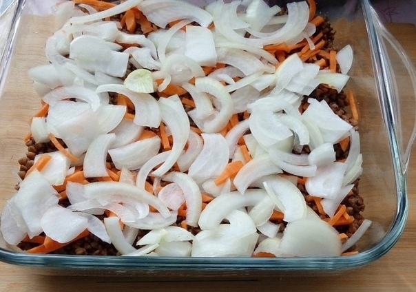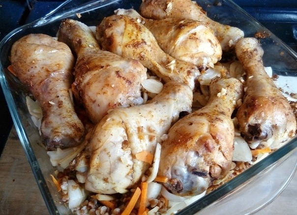 5. В форму для запекания ровным слоем выложить напитавшуюся водой гречку. Покрыть ее тонко нашинкованным луком и морковью. Сверху разместить куриные голени, накрыть фольгой или бумагой для выпечки и поставить в горячую духовку.