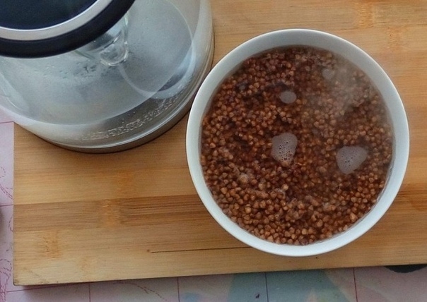 2. Гречневую крупу перебрать и прокалить на сухой сковороде. Затем залить стаканом крутого кипятка, накрыть крышкой, подождать 10-15 минут, чтобы вода впиталась в крупу.