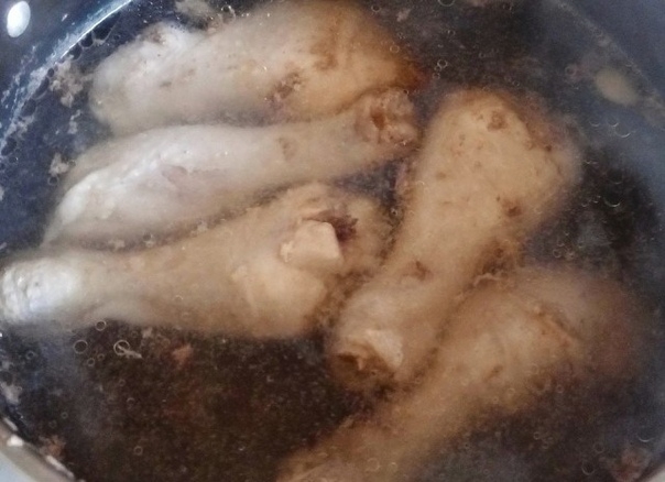 3. Куриные голени залить холодной водой и поставить на сильный огонь. Когда бульон закипит, снять пену и вынуть голени.