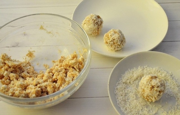 3. Из массы скатать шарики и обвалять в кокосовой стружке.