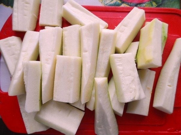 2. Кабачок нарезать на брусочки, предварительно вымыв его и очистив от кожуры и семечек (если кабачок молодой, то можно этого и не делать, а сразу его нарезать брусочками).